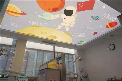位于门诊三楼的儿童口腔科颇具特色,室内设计处处散发着人文关怀——拱形楼道映衬着走廊蓝白相间的底色,诊室顶部的海底世界、太空旅行等不同主题,让孩子们在抬头看牙的过程中仿佛徜徉宇宙空间,恐惧少了,依从性也更好了。