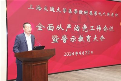 本报讯(通讯员 陆东哲 摄影 陆晓尉)上海交通大学医学院附属第九人民医院党委2024年全面从严治党工作会议暨警示教育大会于4月22日下午召开。党委书记马延斌作医院全面从严治党工作报告,并对党纪学习教育作推进部署,党委副书记、纪委书记张峻作医院党风廉政和行风建设工作报告,党委委员、副院长王长谦作医院审计工作报告,上海市卫健委医政医管处二级调研员宓继红作警示教育专题报告。医院党政领导班子成员、职能部门负责人、科主任、支部书记、护士长、纪检委员代表等200余人出席,党委副书记、院长吴皓主持会议。