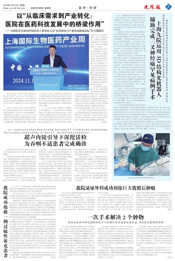 为贯彻党中央、国务院关于深入实施创新驱动发展战略的决策部署以及市委、市政府工作要求,作为上海市医疗卫生机构医学创新改革试点单位之一,我院坚持科技创新、制度创新支撑引领医院高质量发展,围绕临床需求和前沿技术,通过医研企合作形成上下游接力的产业链,协同创新,已实现一批关键技术研发及应用突破,在创新转化方面迈出了一条医疗机构的成功通道,受到了各界广泛关注。